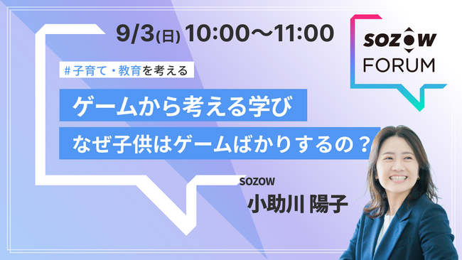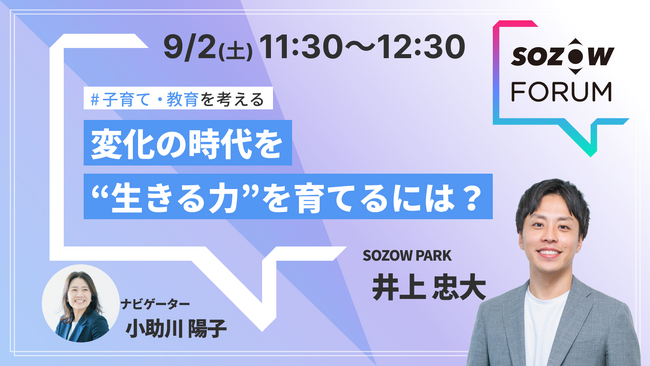 「好奇心と可能性を解き放ち、未来をSOZOWする学びの生態系をつくる」をビジョンに掲げるSOZOW株式会社(所在地:東京都品川区、代表取締役:小助川 将)は、9月より子育てに関わる大人を対象としたオンラインセミナー「SOZOW FORUM」を開催いたします。このイベントを通じて、大人たちが子育てに関わる「正解のない問い」に向き合い、互いに学び合う場を提供することを目指しており、月1回程度の開催を予定しております。