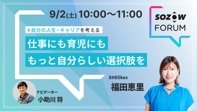 初回セミナーは「SOZOW FORUM 2023秋 "令和の子育て"を考えよう」と題し、9月2日(土)および3日(日)の開催が決定。「変化の時代を生きる力」「ゲームから考える学び」などをテーマに、2日間で合計4つのセッションをお届けします。初回のセッションにはミレニアル世代のライフコーチングカンパニーであるSHE株式会社代表 福田恵里さんを登壇者にお迎えして、「女性の働きかたと子育て」をテーマに女性の生き方について考えます。