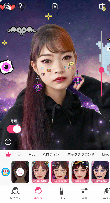 バーチャルメイクアプリ『YouCam メイク』では、最先端のAI&AR技術を活用したリアルなハロウィンメイクをバーチャルで試し、細部にまでこだわった背景フィルターも活用して、ハロウィンの雰囲気を最大限に体験頂くことが可能となりました。