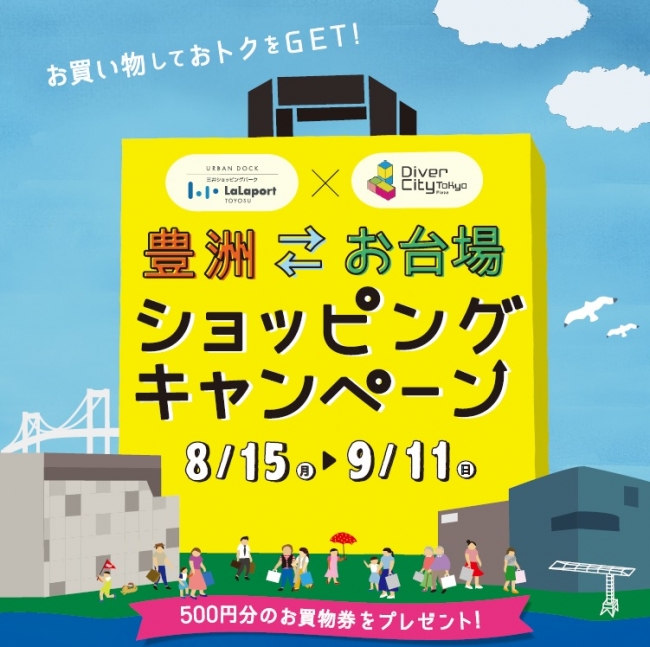 ダイバーシティ東京 プラザまたは アーバンドック ららぽーと豊洲で3,000円(当日・税込・合算不可)以上のお買い物、お食事をしてレシートをGET!レシートを各施設の引換場所でご提示いただくと、もう一方の施設で使えるお買物券500円分をプレゼント!