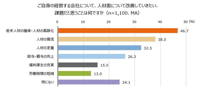 建設業の中小企業経営者1,100名に、経営している会社で人材面について改善していきたい、課題だと思うことについて聞いたところ、「若手人材の確保・人材の高齢化」(46.7%)、「人材の育成」(38.0%)、「人材の定着」(32.5%)と、人材層の若年化とともに、人材の育成や定着に悩みがあることが分かりました。