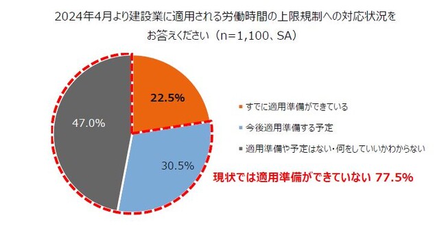 建設業の中小企業経営者1,100名に、2024年4月より建設業に適用される労働時間の上限規制の対応状況について聞いたところ、「すでに適用準備ができている」はわずか約2割(22.5%)にとどまり、半数近く(47.0%)が「適用準備や予定はない・何をしていいかわからない」と回答し、「今後適用準備する予定」(30.5%)と合わせると8割近く(77.5%)が現時点では労働時間の上限規制への適用準備ができていない状況が明らかになりました。