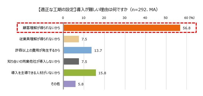 また、導入が難しいという回答があった各制度・施策について理由を聞いたところ、「週休2 日制」と「適正な工期の設定」は「顧客理解が得られないから」という理由が最も多く、どちらも50%を超えました。「現場でのICT 技術活用」では、「導入を主導できる人材がいないから」(47.4%)が最多でした。