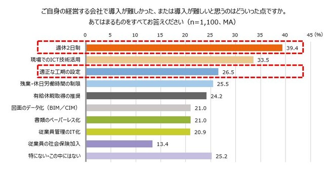 建設業の中小企業経営者1,100名に、経営している会社での導入が難しい働き方や生産性向上に関する制度や施策について聞いたところ、「週休2日制」(39.4%)や「適正な工期の設定」(26.5%)など、働き方とスケジュールに関連する項目の回答率が高い結果となりました。