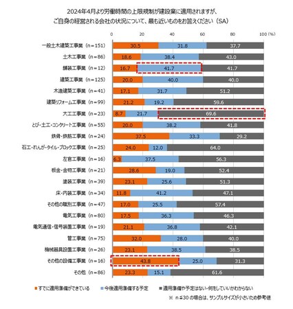 2024年からの労働時間上限規制に約8割(77.5%)が現状対応できていない。「適用準備や予定はない・何をしていいかわからない」と回答した事業の最多は「大工工事業」(69.6%)