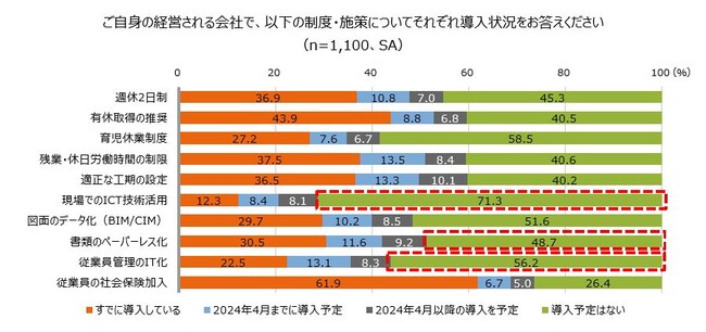 働き方や生産性向上の制度・施策の導入状況は多くの項目で「導入予定がない」が最多。導入予定がないものとしては「現場でのICT技術活用」(71.3%)をはじめITに関連したものが目立つ