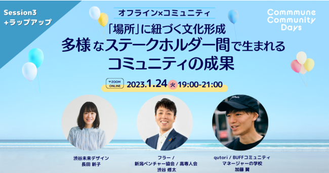 2023年1月24日(火) 19:00〜21:00に、スピーカーとして「BUFFコミュニティマネージャーの学校」を運営するqutori代表取締役・加藤が登壇します。国内外問わず、数多くのコミュニティの知見を持つ加藤が、コミュニティを取り巻く最新潮流や、コミュニティマネージャーの持つ可能性について話します。