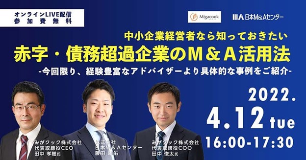株式会社日本M&Aセンター(以下、日本M&Aセンター、本社:東京都千代田区 / 代表:三宅 卓 / URL:https://www.nihon-ma.co.jp/)は、中小企業経営者向けセミナー「中小企業経営者なら知っておきたい 赤字・債務超過企業のM&A活用法」を4月12日にオンラインにて開催いたします。