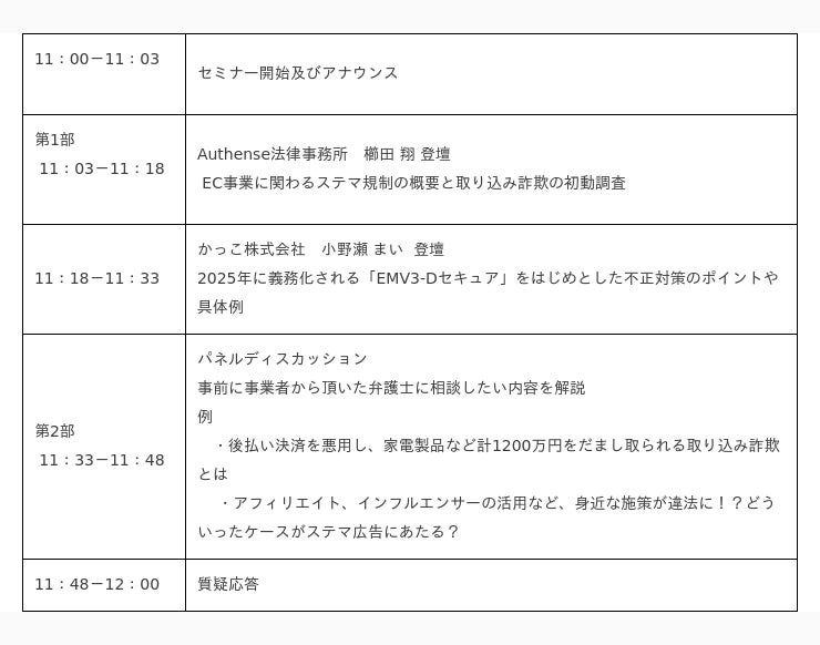 安全なネット通販のインフラづくりに貢献するかっこ株式会社(本社:東京都港区、代表取締役社長CEO : 岩井裕之、証券コード:4166、以下 かっこ)は、幅広い業界での相談や実績豊富な弁護士法人Authense法律事務所(本社:東京都港区、代表弁護士:元榮太一郎、以下Authense法律事務所)と共催で、9月14日(木)に、「注意すべき違法行為と不正注文トラブルの解決策」をテーマにオンラインセミナーを実施いたします。ネット通販事業に関わる取り込み詐欺などの不正注文被害にあった場合の法的措置や、10月から施行される景品表示法が禁じる不当表示に「ステルスマーケティング(以下、ステマ)」が追加される、いわゆるステマ規制について、事業者への影響を交え専門家である弁護士より解説いただきます。かっこからは、そういった被害にあわないための対策として、増加し続けるクレカ不正や悪質転売等の不正の実態や、2025年義務化予定の「EMV3-Dセキュア」をはじめとした不正注文対策についてお伝えします。