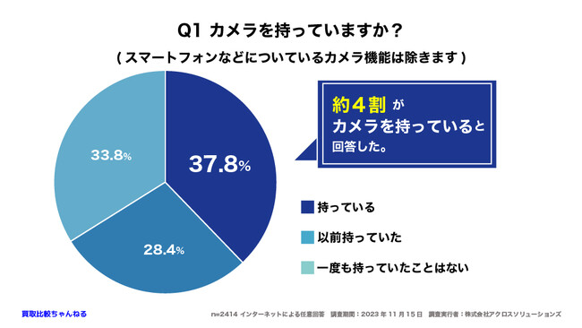 「持っている」と答えた人は37.8%、「以前持っていた」と答えた人が28.4%と、カメラを一度でも所有したことがある人は66.2%という結果になりました。