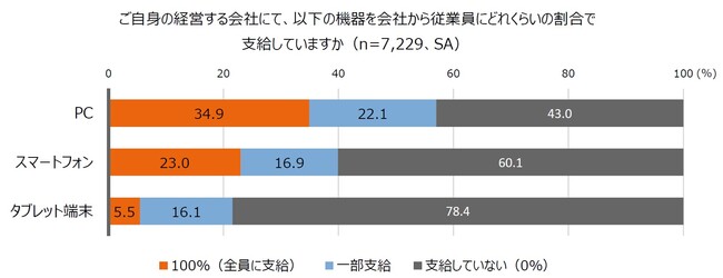 中小企業経営者7,229名に、「PC」「スマートフォン」「タブレット」のIT機器の支給状況を聞いたところ、全員への支給率が最も高いのは、PC(34.9%)となり、一方で、PCを全く支給していないと回答した中小企業経営者が43.0%いることが明らかになりました。