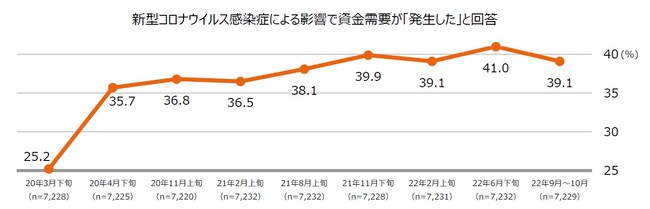 新型コロナウイルス感染症による影響で会社の資金需要が「発生した」のは39.1%で、2月上旬、6月下旬実施調査と比較するとほぼ横ばい