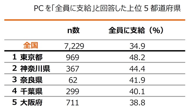 また、PCを「全員に支給」の回答率を都道府県別に見ると、東京都(48.2%)が最も多く、次いで神奈川県(44.4%)、奈良県(41.9%)でした。