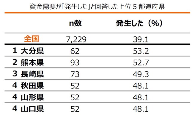 また、資金需要が「発生した」の回答率を都道府県別に見ると、大分県(53.2%)が最も高く、次いで熊本県(52.7%)、長崎県(49.3%)でした。