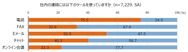 中小企業で社内・社外連絡ツールとしてもっとも使っているのは「電話」。「電話」とともに「FAX」や「Eメール」「オンライン会議」が「社内」より「社外」向けに利用率が高いなか、チャットは「社内」(40.3%)、「社外」(33.1%)と社内での連絡に使われている