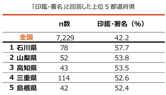 「印鑑・署名」の回答率を都道府県別に見ると、石川県(57.7%)が最も多く、次いで山梨県(53.8%)、高知県(53.5%)でした。