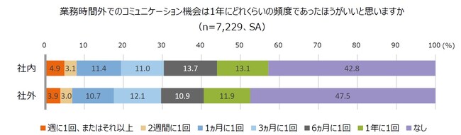 業務時間外のコミュニケーションの希望頻度は「なし」が社内(42.8%)、社外(47.5%)とともに最多