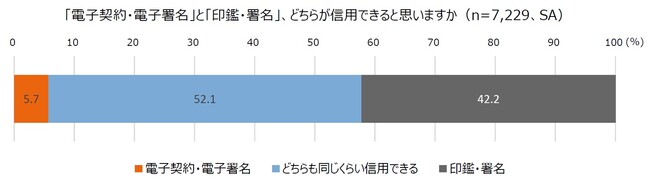 「印鑑・署名」と「電子契約・署名」の信頼性について「どちらも同じくらい信頼できる」が過半数(52.1%)の一方、「印鑑・署名」の回答は4割以上(42.2%)