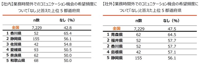 社内の業務時間外コミュニケーションの希望する頻度が「なし」の回答率を都道府県別に見ると、香川県(65.4%)が最も多く、次いで静岡県(56.1%)、佐賀県(54.8%)となりました。また、社外の業務時間外コミュニケーションの希望する頻度が「なし」の回答率を都道府県別にみると、青森県(64.5%)、福井県および香川県(57.7%)となりました。