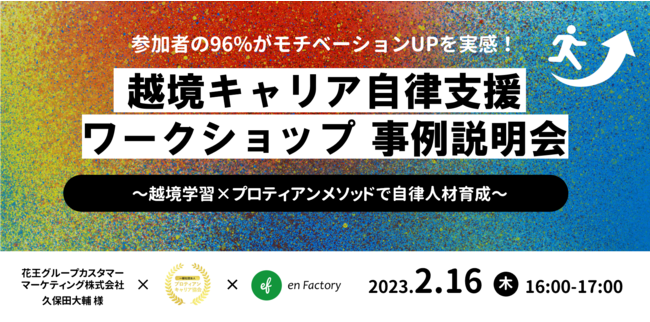 株式会社エンファクトリー(東京都渋谷区、代表取締役社長CEO加藤健太、以下、弊社)は、2023年02月16日(木)16:00-17:00より、一般社団法人プロティアン・キャリア協会と共催し「「越境キャリア自律支援ワークショップ」事例説明会 〜越境学習×プロティアンメソッドで自律人材育成〜」を開催します。 (URL:https://teamlancer-20230216.peatix.com/)