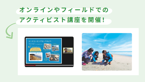1人でも多くの方に海や砂浜のことを知ってもらうため、魅力や課題を伝え広げていってくれる人を「砂浜アクティビスト」と呼び、私たちが活動を応援します。「砂浜ノート」をはじめ「砂浜クエスト」「海を学ぶワークショップ」などの資料やプログラムの使い方を紹介し、誰でも気軽に自然観察会やビーチクリーンを開催できるお手伝いをします。第1回アクティビスト講座は6月末にオンラインにて開催予定。詳細は特設サイトで順次公開します。