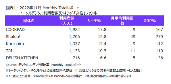2022年11月のニールセン デジタルコンテンツ視聴率 Monthly Totalレポートによると、料理レシピや女性向け情報サービス、女性誌を含む「女性」ジャンルにおいて、PCとモバイルの重複を除いたトータルデジタルの利用者数が最も多かったのはCOOKPADで1,922万人が利用しており、Shufoo!が1,706万人で続いていました。また、月平均利用回数では、Shufoo!が49回で最も多くなっていました(図表1)。