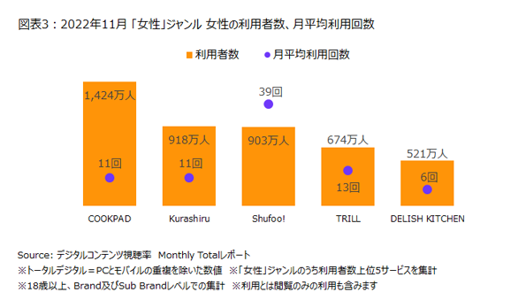 最後に、女性のみの利用状況をサービス別に見ると、利用者数ではCOOKPADが最も多く1,424万人で、Kurashiruが918万人で続いていました。また、月平均利用回数ではShufoo!が39回で最も多く、TRILLが13回で続いていました(図表3)。