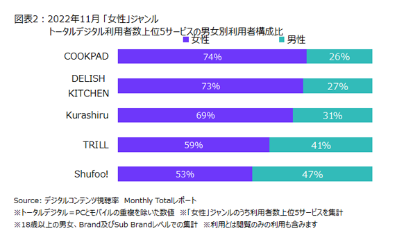 次に、各サービスの男女別利用者構成比を見ると、どのサービスも女性の占める割合が高くなっており、特にCOOKPAD、DELISH KITCHEN、Kurashiruでは女性が約7割を占めていました(図表2)。