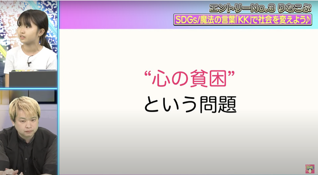 社会をより良くする取り組みやアイデアを発信する「SDGsチャレンジアワード」で「魔法の言葉『KK』で社会を変えよう♪」というテーマのプレゼンを発表したのは、小学5年生のりなこぷさん。世界の貧困問題を調べる中で、貧困地域の子どもたちが笑顔で幸せそうに見えるのに、お金やモノに恵まれていても悲しそうに見える人がいることに疑問を感じ、「心の貧困」に目を向けたと言います。