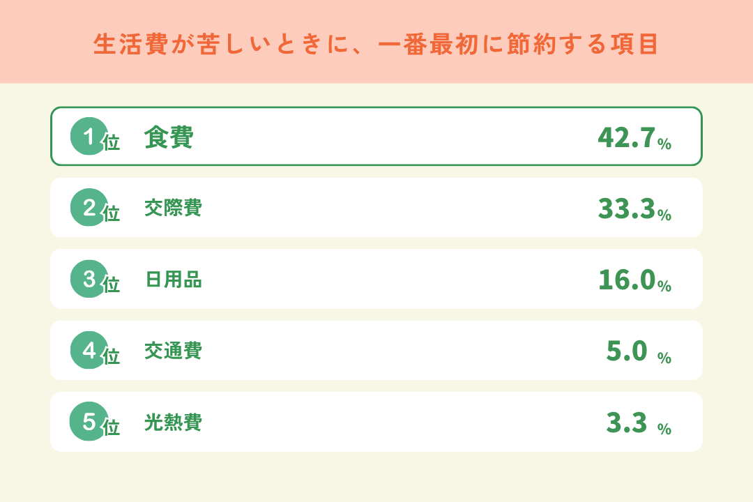 「生活費の中でまずどの項目を削りますか?」という質問に対し、全体の約4割が「食費」と回答しました。[画像3: https://prcdn.freetls.fastly.net/release_image/122970/107/122970-107-00fc222f38230d87775623fe8d872851-1080x720.png?width=536&quality=85%2C75&format=jpeg&auto=webp&fit=bounds&bg-color=fff ]