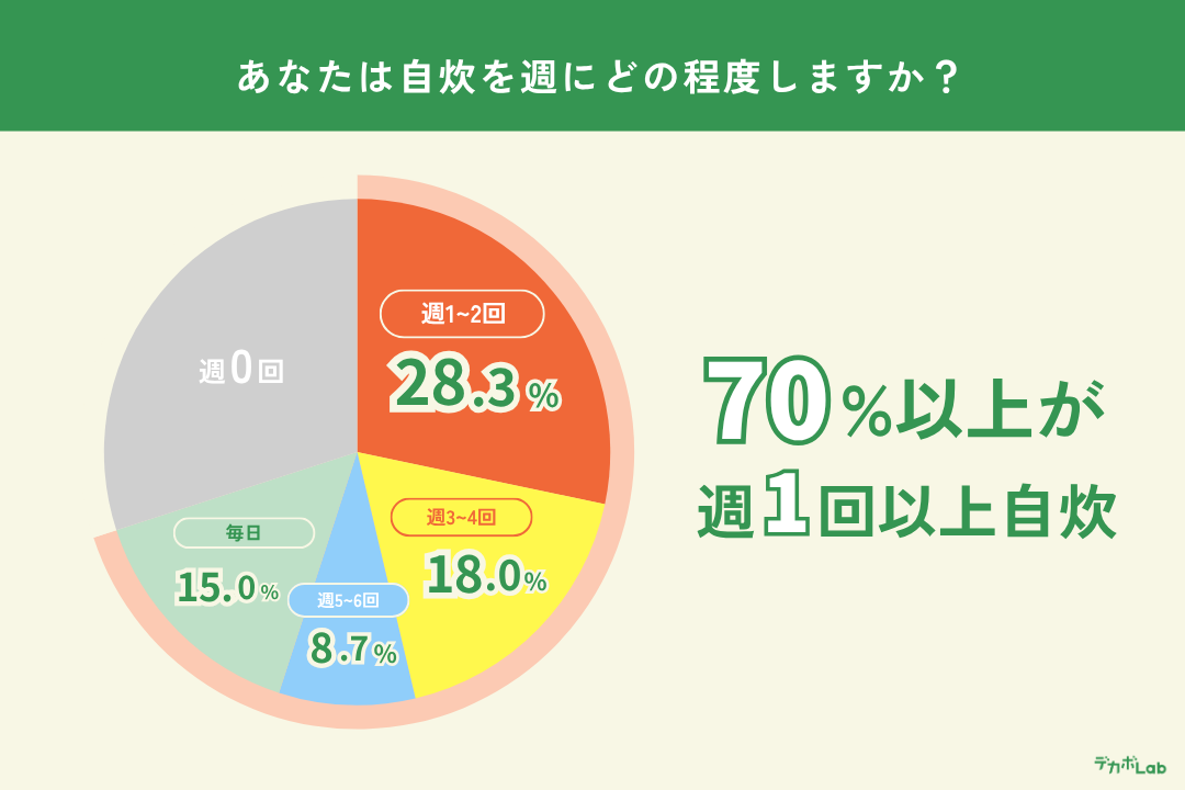 「週にどの程度自炊をしますか?」という質問に対し、週1回以上自炊すると回答した人は全体の約70%となりました。さらに、一人暮らしの回答者に限定すると9割を超える結果に。また、「毎日自炊する」と回答した人も15%にのぼりました。[画像4: https://prcdn.freetls.fastly.net/release_image/122970/107/122970-107-5588a14195ecbc6551637d3c4735fec1-1080x720.png?width=536&quality=85%2C75&format=jpeg&auto=webp&fit=bounds&bg-color=fff ]