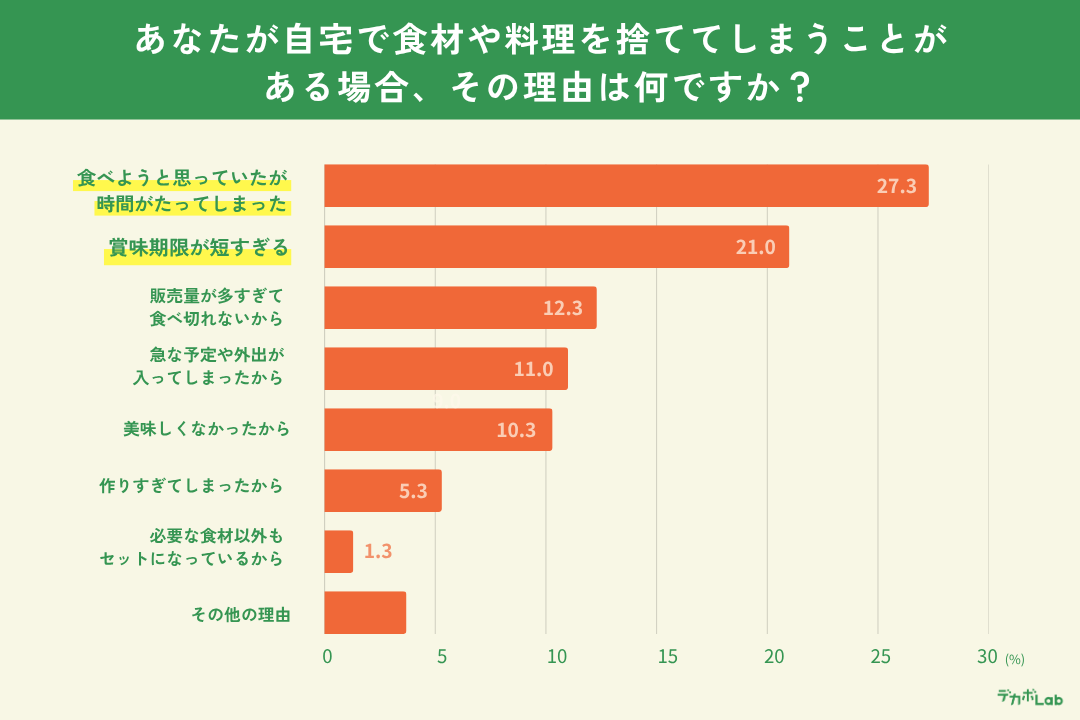 食材を余らせる理由としては、「食べようと思っていたが時間がたってしまった」(27.3%)が最も多く、次いで「賞味期限が短すぎる」(21.0%)が続きました。
