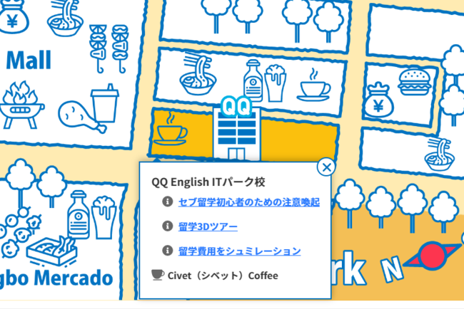 例えば、QQ English ITパーク校をクリック/タップすると下記のように、詳細な情報を確認することができます。