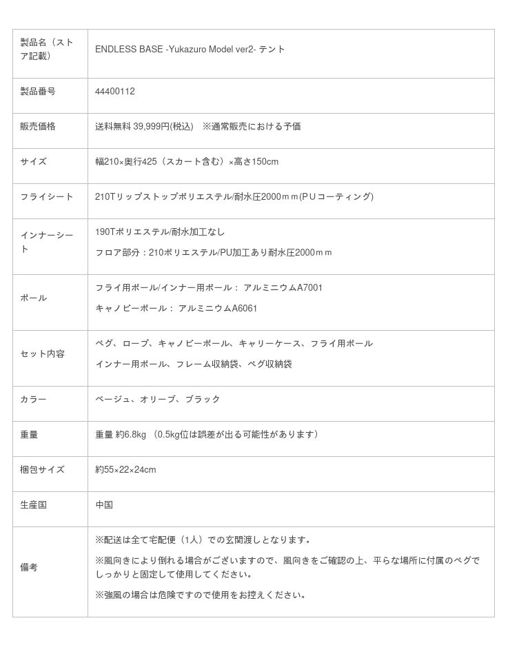 【単品】Yukazuro Model ver.2 テント本体〔品番:44400112〕