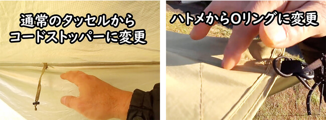 前作で多くあったタッセルはスカートとインナー頂点部分以外をコードストッパーなどに変更し、固定しやすくしています。またキャノピーリングを外付けに変更することで、キャノピー部分の生地の耐久性を高めています。