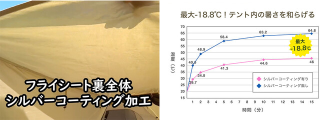 またこのシルバーコーティング加工によって、高い遮熱効果も見られます。日光を模した光を15分照射した実験では、未加工の生地と比較して最大18.8℃の温度差を確認しており、夏の猛暑においてもテント内の温度上昇を軽減する効果が期待できます。