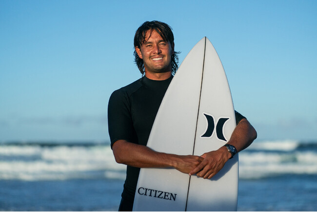 この度シチズン時計とスポンサー契約を結ぶことになりました。サーファーの僕が時計会社のサポートを受けるというのは新しいことですし、何よりシチズンという日本を代表する企業と契約できたことを大変光栄に思っています。サーファーにとって時計は波のタイミングや練習ドリルを計測するなど、なくてはならないアイテムです。そういった海の中での実用性の部分だけでなく、陸の上でのファッションアイテムとして着用できるシチズンが僕を応援してくれることはとても心強いです。プロサーファーとして更に結果を出せるよう、頑張りたいと思います。