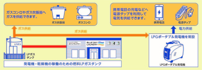 災害対応型ランドリーは「標準仕様」として3日分のLPガスを貯槽できるLPガスタンク、ポータブル発電機への接続が可能な設備を完備します。ポータブル発電機はガスを利用して発電する仕組みになっており、携帯電話充電などへ電力供給することが可能です。また、店舗にガスコンロ、ガス炊飯器を導入し、被災者向けの炊き出しが可能になります。昨今の社会情勢により三密回避に向けた分散避難が必要となる中、コインランドリーを“臨時避難所“として活用する事ができます。