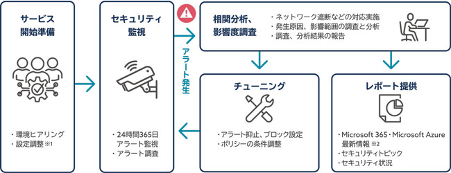 「Microsoft 365 E5 Security」と「Microsoft Defender for Cloud」で検知されたアラートをセキュリティアナリストが 24時間 365日で監視します。あらかじめ、お客さまの環境を把握したうえで、「Microsoft Sentinel」(※3)を活用し、「Microsoft 365」「Microsoft Azure」のログと、ファイアウォール、プロキシといった通信ログなどを相関分析することにより、脅威の影響度を判断し、対処が必要なアラートのみを通知します。