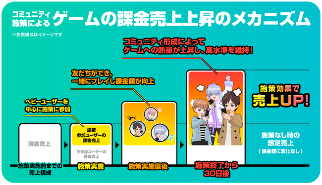 実際に、コミュニティ施策を実施したゲームタイトルでは、施策に参加したユーザーとそうでないユーザーの課金額に差が出ており、コミュニティ施策がゲームの課金売上上昇に貢献していることがわかっています。