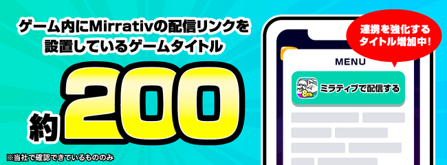 約200タイトルのゲームがゲームアプリ内にMirrativの配信リンクの設置して、Mirrativとの連携を強化し、ゲームのユーザーにMirrativ配信を推奨しています。ゲームアプリ内にMirrativの配信リンクを設置すると、ユーザーはそこから配信や視聴が可能となります。ゲーム会社さまは、SDK組み込み不要・ディープリンクを設置するだけという開発不要の手軽さも、重要視される理由の一つです。多くのゲーム会社さまにおいて、ユーザーコミュニティの活性化のために、Mirrativでの配信は重要視されています。