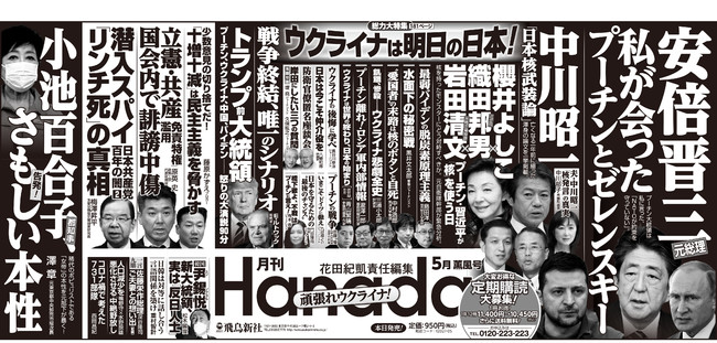 ロシアによるウクライナ侵攻に関して、安倍元総理が3月25日発売の月刊『Hanada』(飛鳥新社刊)5月号の独占インタビューに応じ、総理大臣時代にプーチン大統領からアメリカやNATOに対する不満を聞いていたこと、ゼレンスキ―大統領にミンスク合意を早急に実行するよう直接伝えていたことなど、これまで語られてこなかった事実を明らかにしました。