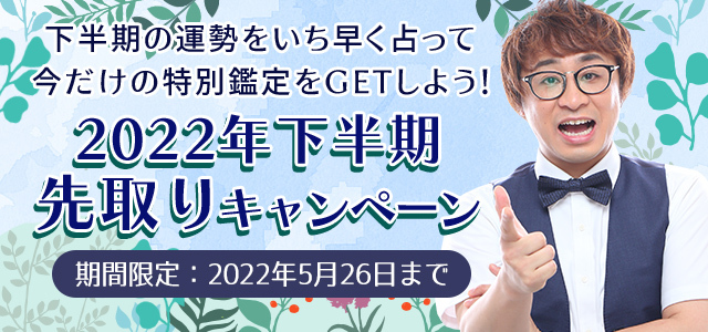 『2022年下半期先取りキャンペーン』では、1年の後半を占う鑑定をご提供。2022年下半期の運勢がいち早く占えるまたとない機会となっております。キャンペーン期間中にこちらの鑑定を占うと、今だけの特別鑑定をGETできます。この機会にぜひ「アポロン山崎の占い」でどこよりも早く2022年下半期の運勢を先取りしましょう!