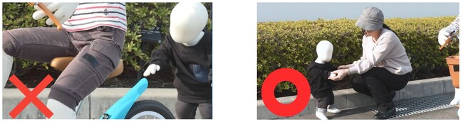 こどもを乗せた自転車が倒れると、こどもが地面にぶつかり、けがを負うおそれがあるので、絶対にこどもを乗せたまま、自転車から離れないでください。また、バランスを崩しやすいため、傾斜地などに絶対に駐輪しないでください。