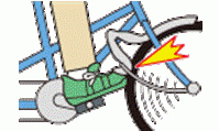 足が車輪や泥よけに接触すると、車輪に巻き込まれて、急にロックして転倒するおそれがあります。