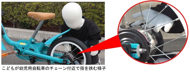 「指を挟み込む事故」は、こどもが自転車を使用中に、ほかのこども(特に1歳から2歳)が自転車に近づいて、回転部分に手を触れることで多く発生しています。車輪、チェーン、ギヤには手や足を絶対に触れないように、保護者がしっかりと見守りましょう。