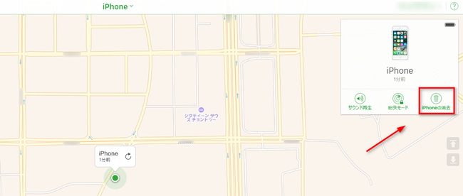 サインイン後、「iPhoneを探す」をクリックします。画面の上部にある「すべてのデバイス」からロック解除したいiPhoneを選択して、「iPhoneの消去」をクリックすると実行されます。