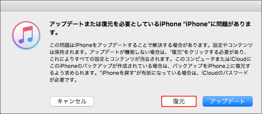 ステップ2.iTunesで以下の画面が表示されますので、[復元]をクリックします。数時間がかかるので、少しお待ち下さい。復元できましたら、自動的にiPhoneを初期化します。
