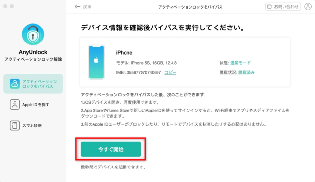 4.デバイスの脱獄が完了したら、「今すぐ開始」をクリックします。