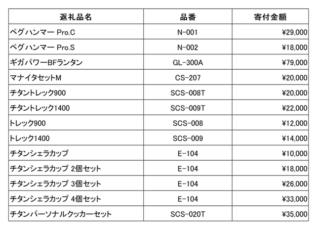 ●スノーピークの「チタンシェラカップ」や「チタンパーソナルクッカーセット」など13品目を新規返礼品として採用